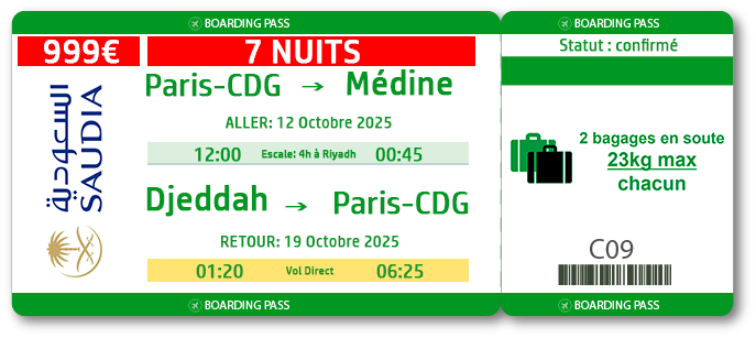 • 3 ou 4 nuits à Médine | 4 ou 5 nuits à Makkah